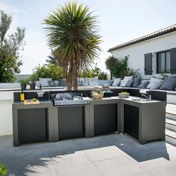 Ces mobiliers haut de gamme sont garantis 2 ans. Leur résistance à la rouille et aux intempéries leur assure une longue durée de vie. Les différents modules se fixent entre eux et se déplacent à votre convenance, afin de rendre votre cuisine unique et adaptée à vos besoins. Leur design épuré s’intégrera parfaitement dans votre jardin.